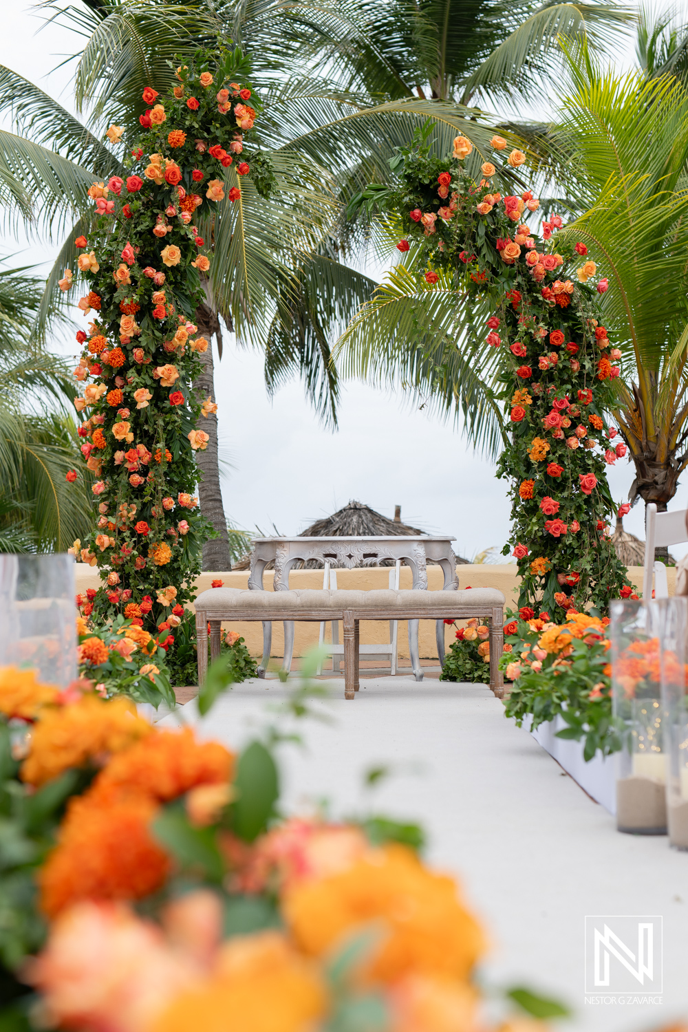 Wedding ceremony at Avila Beach Hotel in Curacao with stunning floral decorations and a tropical backdrop