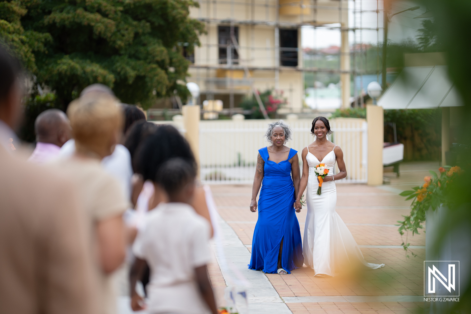 Beautiful bride walks down the aisle with her mother during a destination wedding at Avila Beach Hotel in Curacao