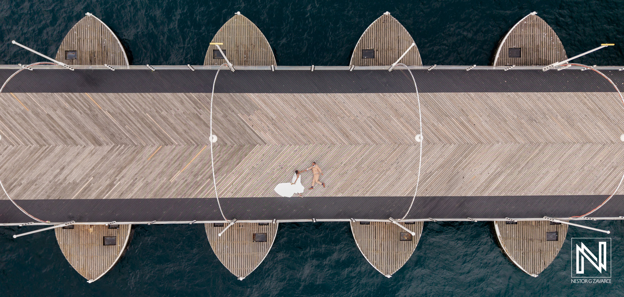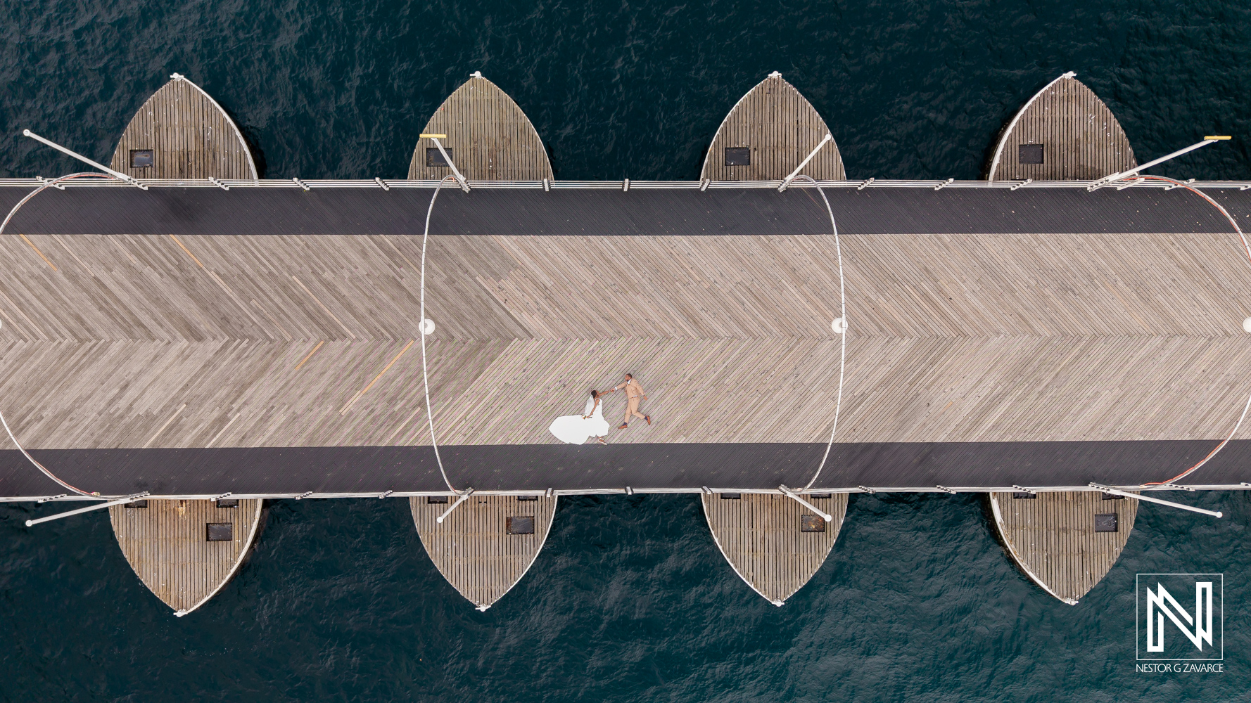 Destination wedding at Avila Beach Hotel in Curacao features bride and groom on scenic pier