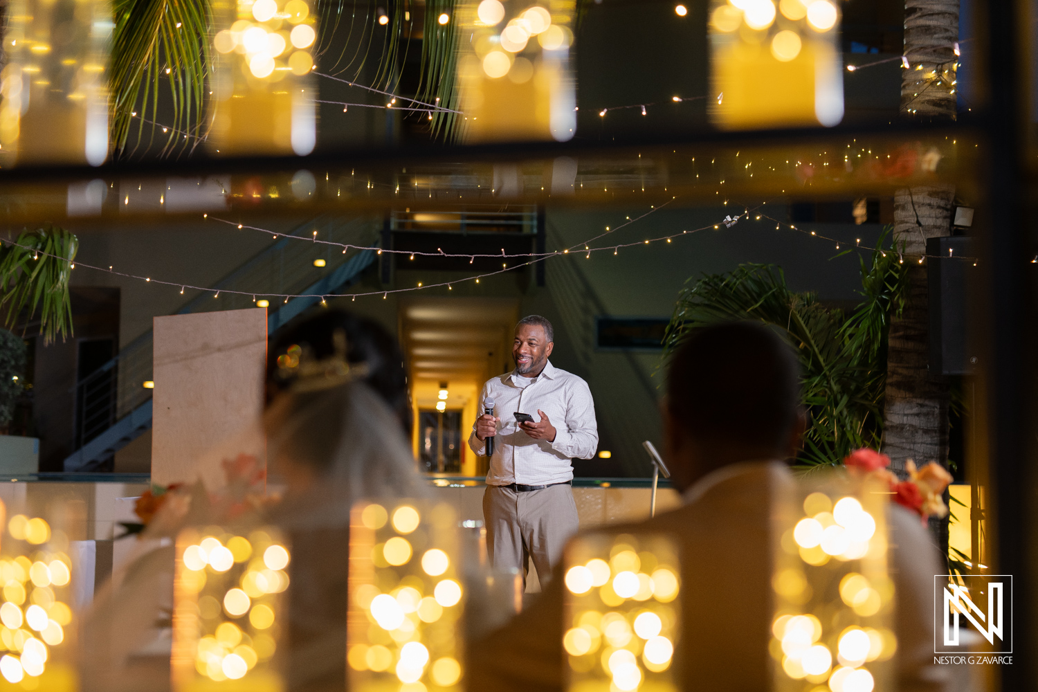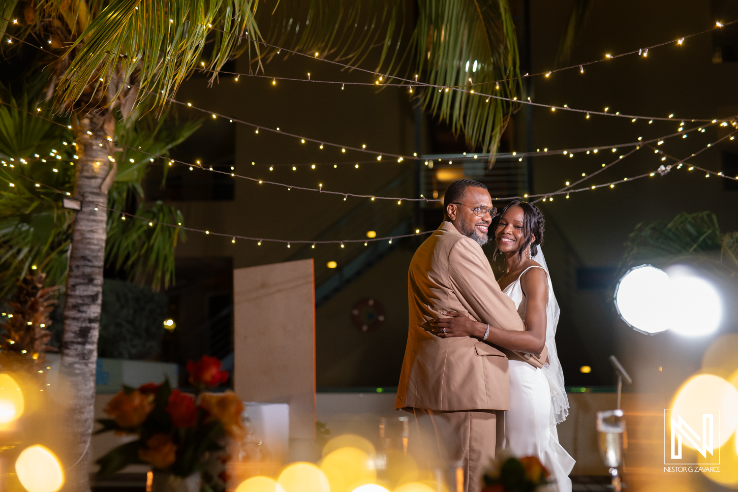 Beautiful wedding celebration at Avila Beach Hotel in Curacao with joyful couple under glowing lights