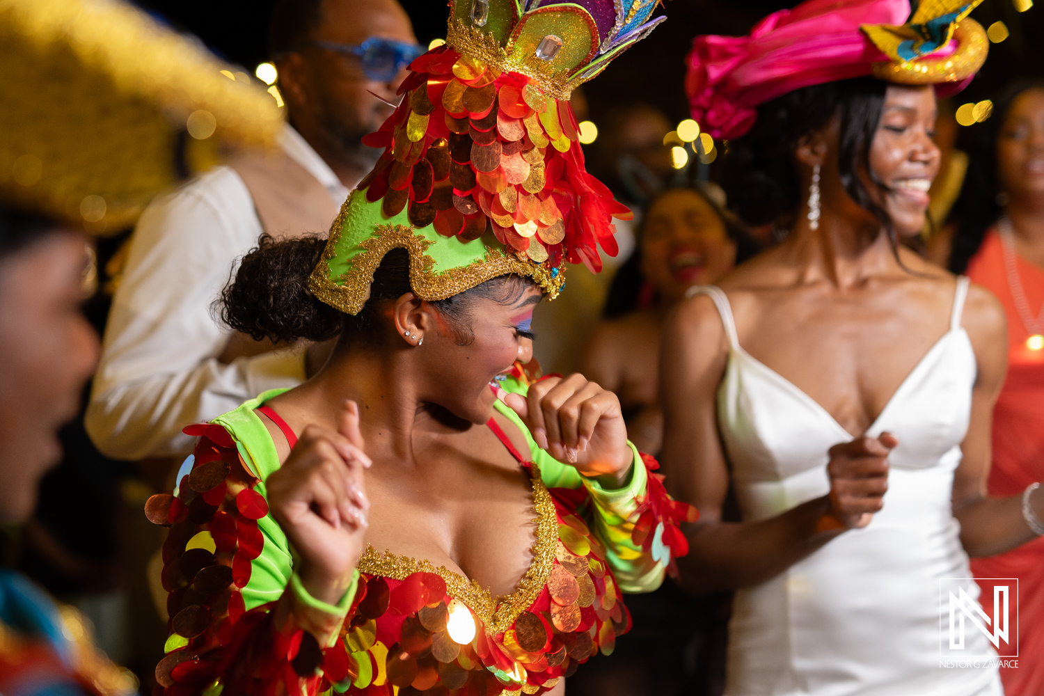 Dance celebration at a colorful wedding reception in Avila Beach Hotel, Curacao, full of joy and vibrant costumes