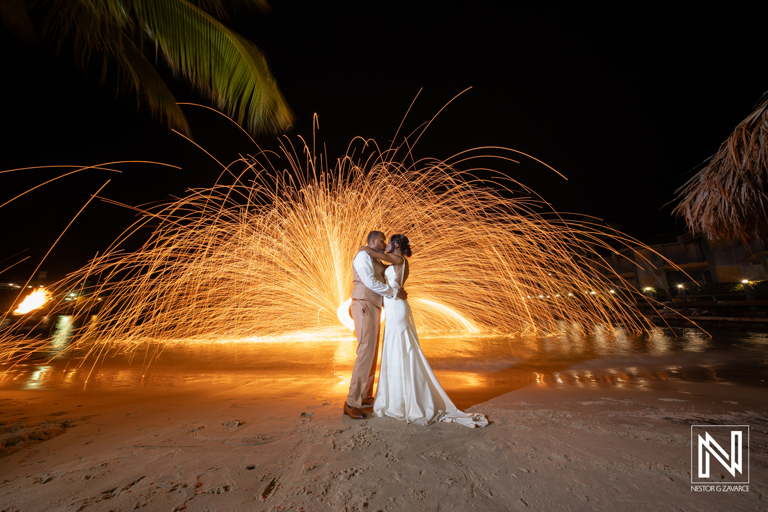 Couples celebrate their destination wedding with a stunning fire performance at Avila Beach Hotel in Curacao